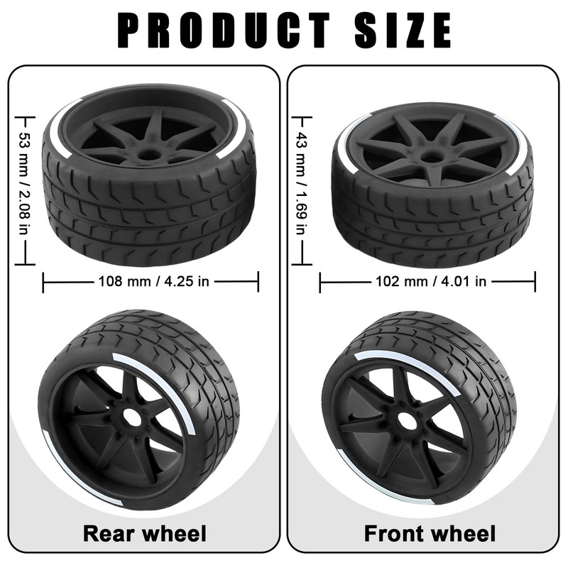 - 【Tire Diameter】 4PCS/Set, 2 Big tires size: Outer diameter(Height): about 107mm ( 4.21inch ) / width: about 53mm ( 2.09 inch )/Inner diameter: 80mm ( 3.15inch); Hex: 17mm. 2 Small tires size: Outer diameter(Height): about 102mm ( 3.94inch ) / Width: about 43mm ( 1.65 inch );Hex: 17mm,fit 1/7 on road Rc car. Please check the size before you purchase.