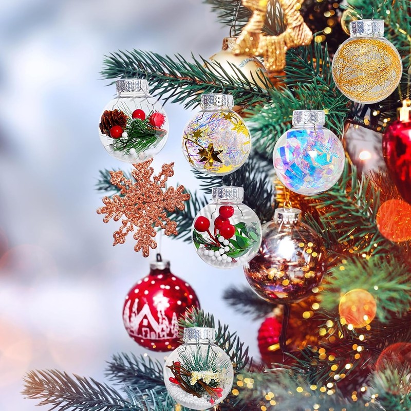 - 🎄 Cute light bulb design: This plastic baubles features a small and cute light bulb design, with transparent decorative balls adorned with various Christmas themed acacia beans, Christmas trees, and more. The circular shape hangs on the green Christmas tree, perfectly combining to make Christmas baubles 60 mm look unique. A very festive atmosphere
