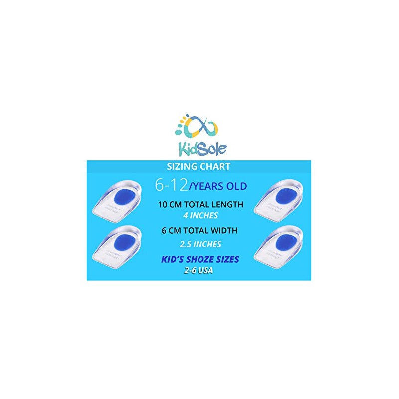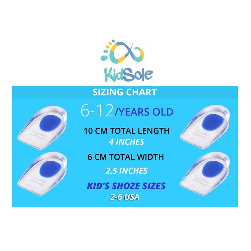 - Includes 2 Pairs (4 Heel Cups) of our KidSole Gel Shock Absorbing Heel Cups. They are perfect for US Kids Sizes 3-6. Heelcup is 10 CM long and 6 CM wide.