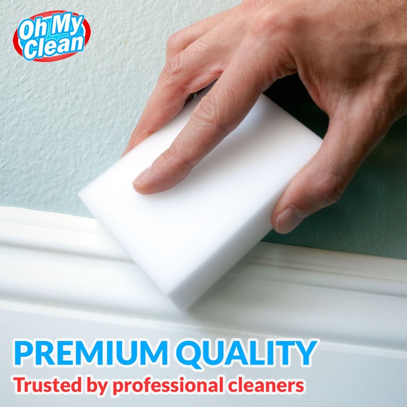 - WHILE SOME OTHER ERASER SPONGES are too small, don’t work, or simply fall apart, we raised the bar and designed our eraser sponges to be extra thick for long lasting cleaning power. With premium quality melamine foam and incredible density, Oh My Clean eraser sponges easily lift away scuffs and grime, every time.