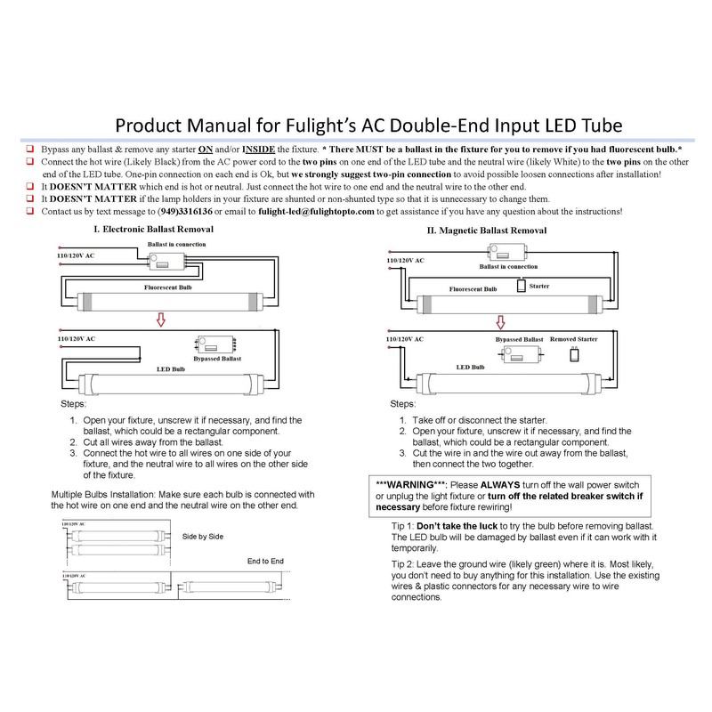 - ***Please DON'T buy if you don't expect to modify your light fixture***: MUST be directly wired to the 120V AC Power! Please disconnect Ballast (& Starter if there is any) before plugging in the bulb. Installation Manual is attached as the 2nd photo at the left upper corner of this product page!
