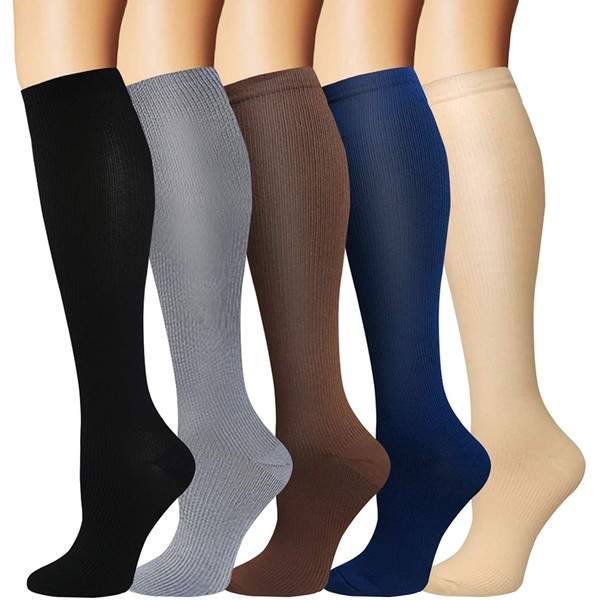 5 Pairs Knee High Graduated Compression Socks For Women and Men - Best Medical, Nursing, Travel & Flight Socks - Running & Fitness - 15-20mmHg (L/XL, Assorted 2)