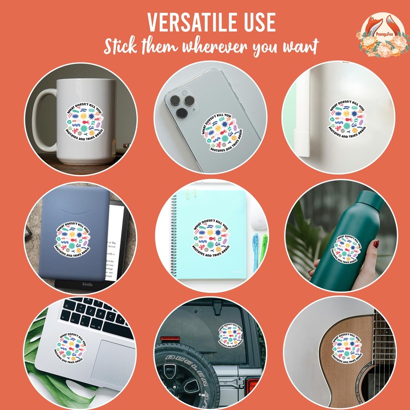 (5Pcs) What Doesn't Kill You Mutates and Tries Again Sticker Bacteria Decal Waterproof Vinyl Stickers Adult for Laptop Kindle Car Tumbler Water Bottle Mug Phone Notebook - Size 3”x3”