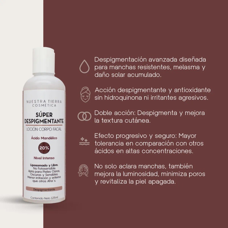 Nuestro Ácido Mandélico al 20% no es solo un despigmentante, es un tratamiento completo de renovación celular. 🔄 Su acción exfoliante ayuda a minimizar la apariencia de finas líneas y arrugas, alisa la textura de la piel y unifica el tono, como si estuvieras retrocediendo el reloj. ⏳ Y lo mejor de todo, ¡es apto para todo tipo de piel! 🥳 Su fórmula suave pero efectiva, trabaja delicadamente para eliminar las manchas sin causar irritación, incluso en las pieles más sensibles. No esperes más para transformar tu piel. ✨