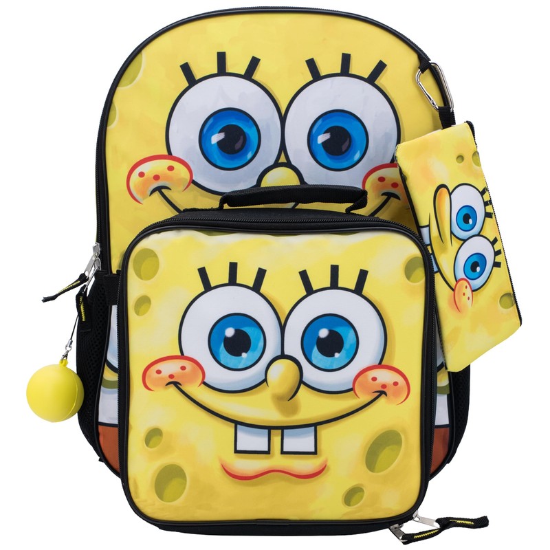 - Spongebob 5 Piece Backpack Set: “I’m ready!” If you are a fan of the Bikini Bottom then this Spongebob backpack set is perfect for you to take back to school! The set includes a 16 inch big face Sponge Bob backpack, a detachable big face Sponge Bob lunch box, gadget case, carabiner, & fidget squish ball.
