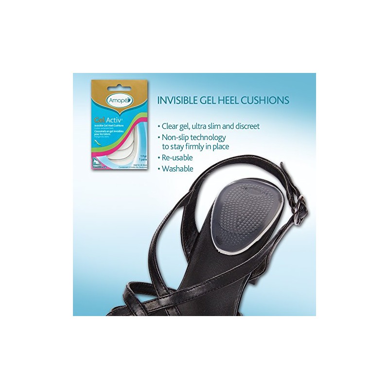 We understand that a perfect pair of high heels can make you look and feel great. But regardless of how great they look, they can start to hurt after a while and you feel like taking them off. Now you don't have to sacrifice comfort for the sake of style anymore. Introducing the latest innovation from Amopé. New Amope GelActiv Insoles are the cushioning gel insoles that transforms fashion heels into your favorite pair of comfy sneakers. These gel insoles and gel inserts for women are made of soft, elastic gel to help relieve pressure and discomfort from your feet to keep you going all day. They sit perfectly between the slope of your shoes and sole of your foot to provide maximum level comfort and support that you would come to expect a premium womens insoles. Amope gel insoles and shoe inserts were designed and assessed in consultation with podiatrists and foot care specialists. Powered by GelActive technology, they provide superior cushioning and shock absorption for lighter-feeling feet all day. Now looking great and feeling great in your high heel shoes are not mutually exclusive. Tried gel insoles before and didn’t like them? These womens insoles are different. Ultra thin insoles won’t crowd your toes. Transparent and discreet shape means they won’t show. Unique non-slip adhesion gel ensure the insole and your feet stay firmly in place yet can be removed/reapplied. Fully Washable and Reusable. Pack Contents: 1 pair of Amopé GelActiv Invisible Gel Heel Cushions gel inserts