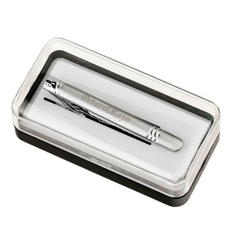 - ♦ The engraving is permanently burned into the metal with a laser and has a black colour. The tie pin can be individually designed and makes a great gift. The tie clip comes in a gift box.