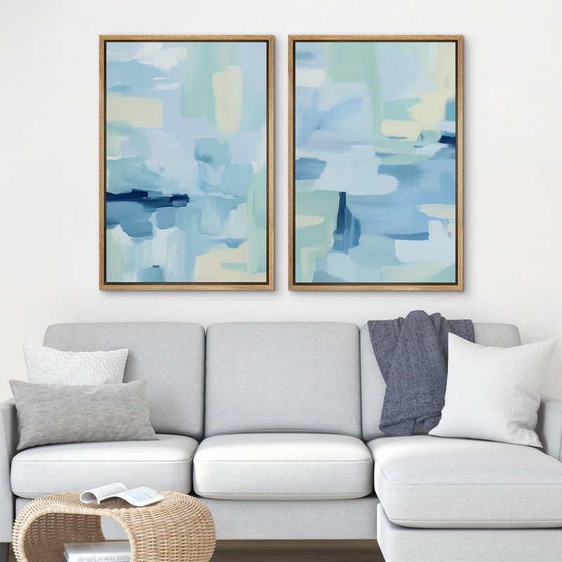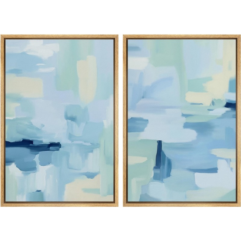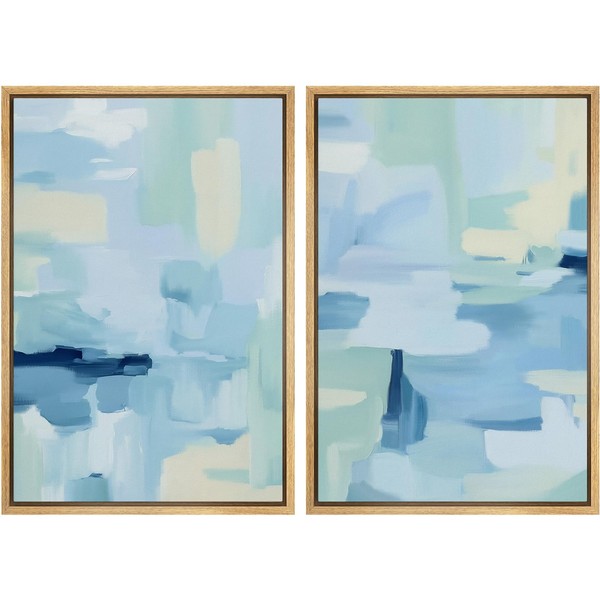 Ashbrook Framed Canvas Print Wall Art Set Blue and Aqua Abstract Brushstroke with Soft Pastel Tones Illustrations Modern Art Decorative for Living Room, Bedroom, Office - 24"x36"x2 Natural