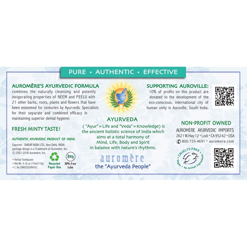 Auromere Ayurvedic Herbal Toothpaste, Fresh Mint - Vegan, Natural, Non GMO, Fluoride Free, Gluten Free, with Neem & Peelu (4.16 oz), 1 Pack