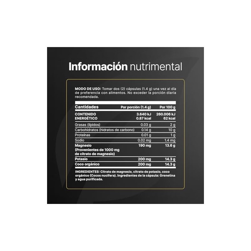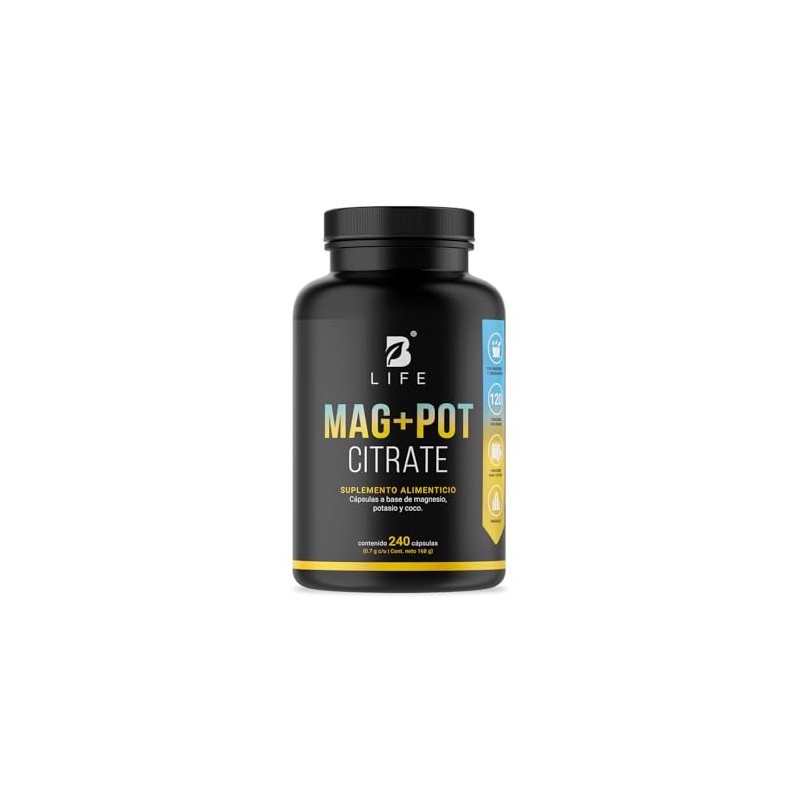 • ¡Mag+Pot Citrate B Life, tu vitalidad natural! Cada cápsula de 700 mg contiene una formulación única con Citrato de magnesio, Citrato de potasio y está enriquecida con Coco orgánico, un activo que potencia los beneficios individuales de cada ingrediente. Esta combinación exclusiva apoya la relajación muscular y la reducción del estrés, ofreciendo una sinergia valiosa de minerales, antioxidantes y vitaminas que no se encuentra en otras presentaciones. Contiene 240 cápsulas.