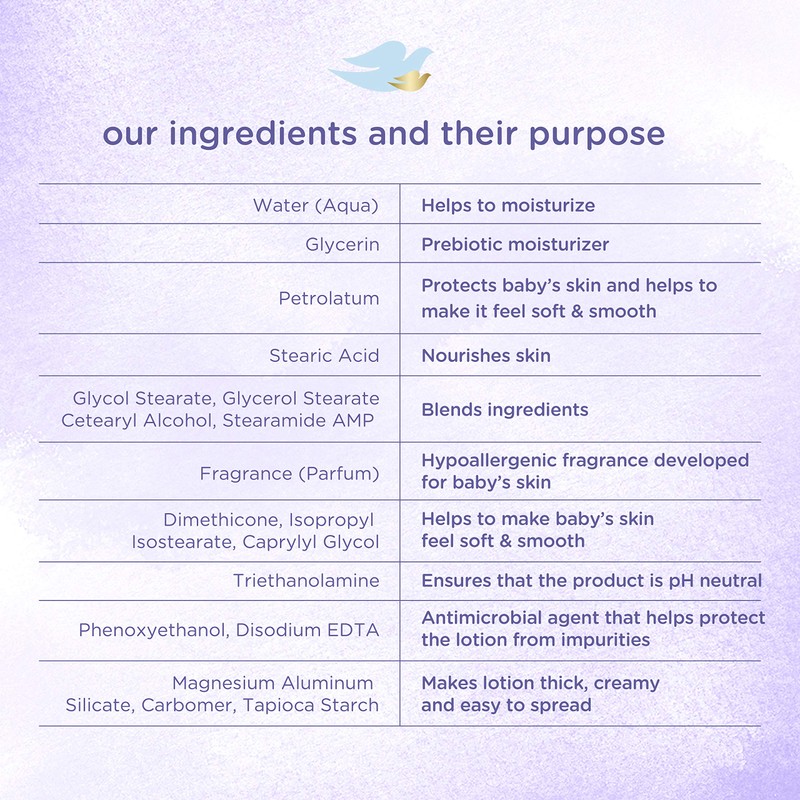 - CALMING CARE: Baby Dove Calming Moisture Hypoallergenic Baby Lotion (13 oz.) is a nourishing baby lotion with a calming chamomile scent