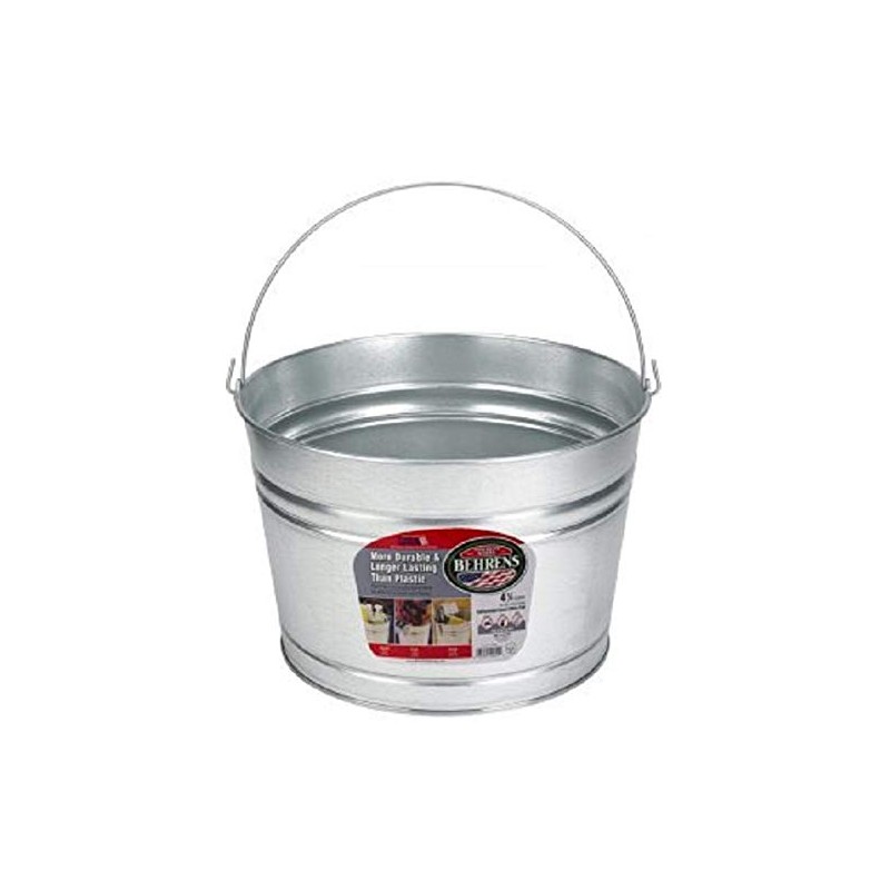 Quantity of (4): Behrens C17GS 4.25 Gallon Galvanized Sheet Steel, Round, Wash Tubs, Features Galvanized Steel Carrying Bail, Top Measures 12-1/8", Bottom Measures 11-1/8" & Height is 9". Made in USA. IIdeal for cleanup, wet or dry carry, storage and more. Durable…the strength of steel. Better than plastic: Rodent proof Won’t absorb odors Recyclable…made with no oil Built to last Offset bottom keeps pail off ground Wire reinforced top rim Deep swedging adds strength