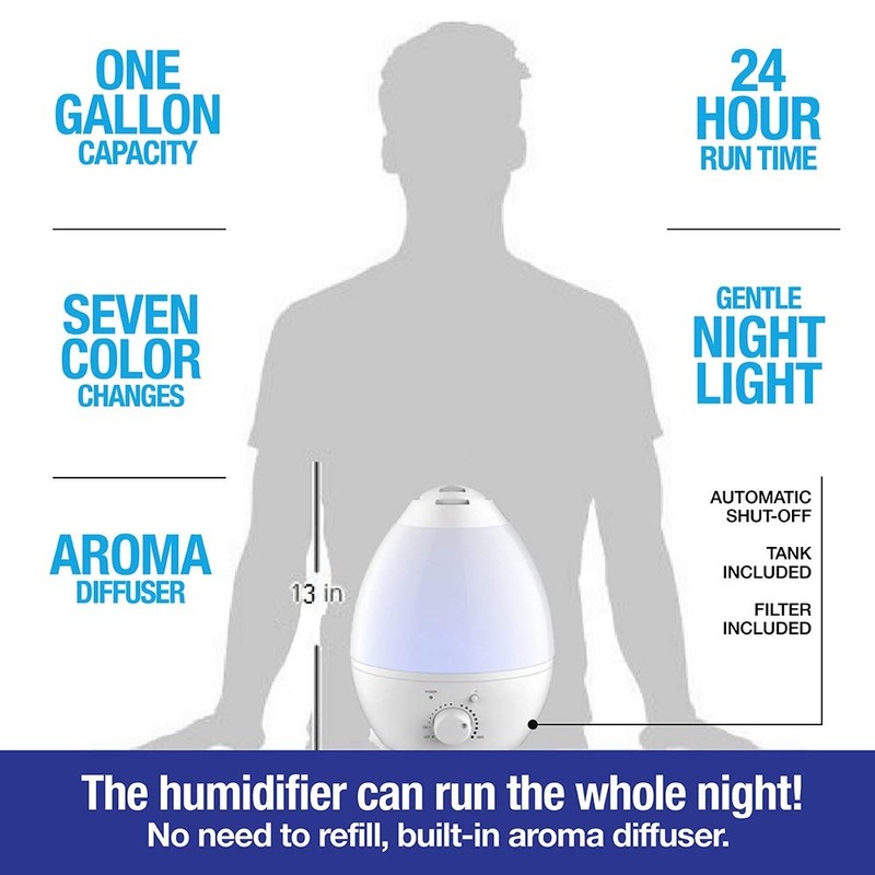 - This humidifier has a built-in 7 color LED night light, set your select color rotate option, will make it the perfect humidifier