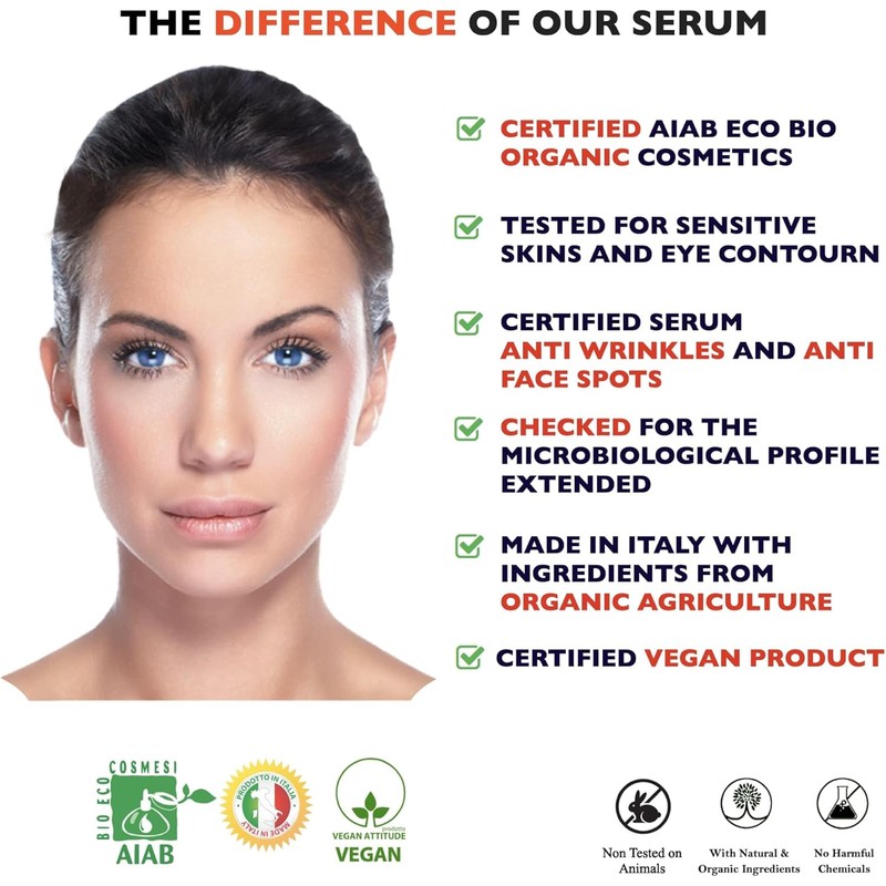 - DERMATOLIGIST TESTED, CERTIFIED ORGANIC AND VEGAN: Focusing on organic ingredients, we have created a vitamin C serum for all skin types, 100% vegan, hypoallergenic, cruelty-free, AIAB certified organic and dermatologically tested by the University's Dermatology Department of Ferrara. This skin care facial oil is free from parabens and other harmful chemicals you don't want. Our brightening facial skincare serum is committed to eco-friendly beauty: the box and bottle are 100% recyclable.