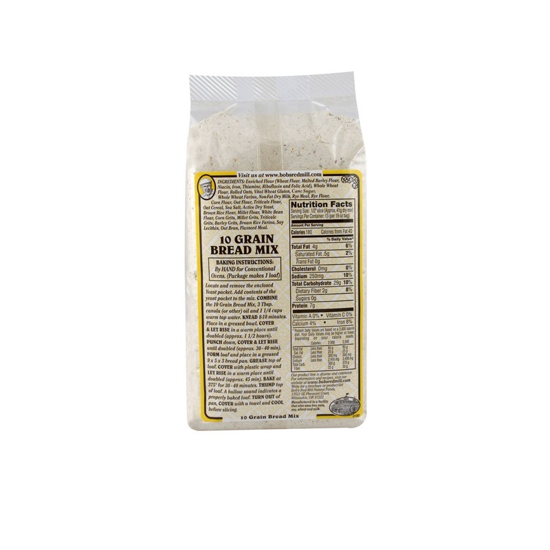 Bob's Red Mill 10 Grain Bread Mix takes the guesswork out of preparing wholesome, nutritous loaves at home. We've blended some of our favorite flours and a sprinkle of flaxseeds to create this wonderful mix. Besides making a basic loaf, also try this mix to make bread pudding, croutons, stuffing, or bread salad. All you need from your pantry is 3 Tbsps vegetable oil and 1 1/4 cups warm water. One 19-oz package makes one loaf.