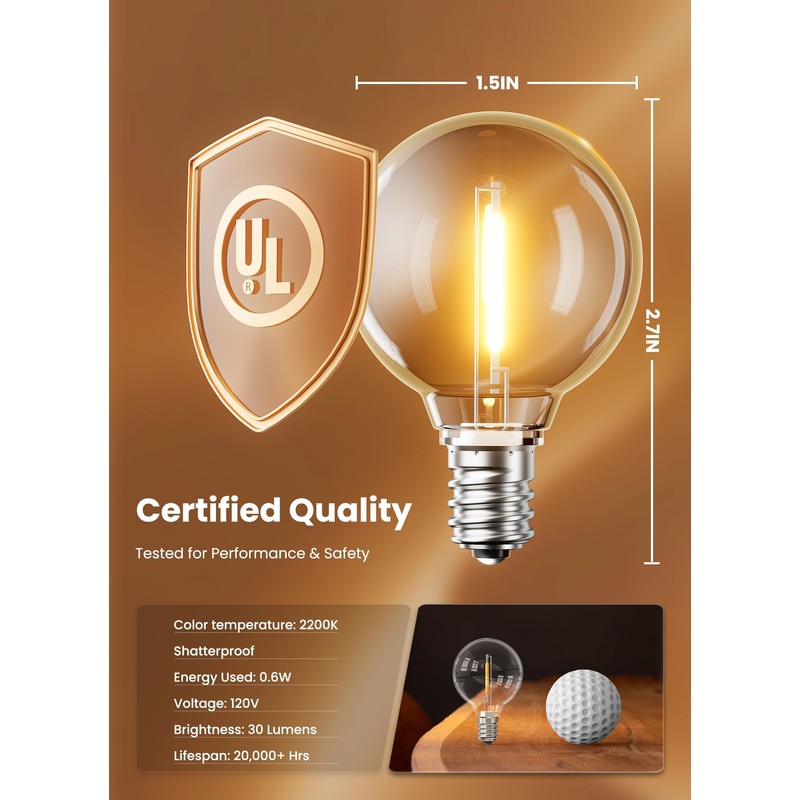 - Shatterproof LED Light Bulb: 1.5 inch globe shatterproof warm light bulbs made of plastic, much shatterproof than traditional glass bulb. 25 counts outdoor light bulbs per pack. Each string light bulbs has been inserted into it's own compartment to prevent cracking