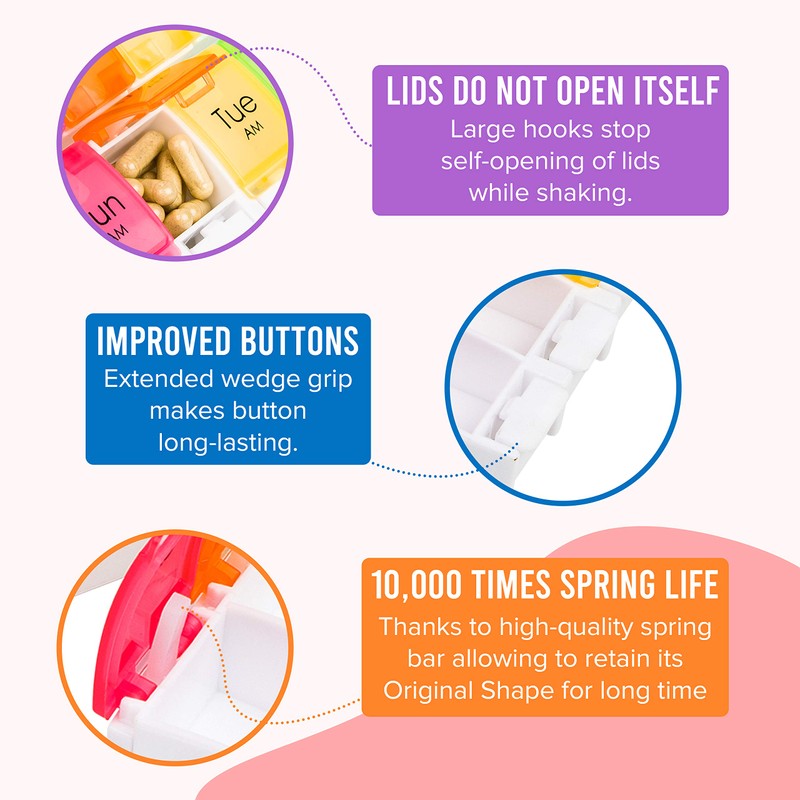 - ??7- DAY AM/PM PILL DISPENSEROur organizer comes in a 7-day pill pot with the AM/PM separator. This stops you from taking meds twice or not taking them at all. Simply organize from Monday to Sunday once and have a better track of your medication for an entire week. No need to remember the daily dose. Store all your medicine once and enjoy complete peace of mind