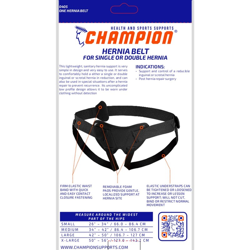 Champion brand (model C-405) hernia belt for single or double hernia. This belt is a lightweight, sanitary hernia support that's very simple in design and easy to use. It serves to comfortably hold a either a single or double inguinal or scrotal hernia in reduction, and can also be used in special situations after a hernia repair to prevent recurrence. Its uncomplicated low profile design allows it to be worn under clothing without detection.