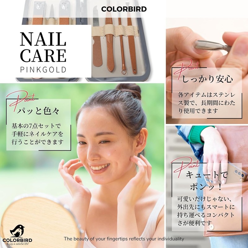COLORBIRD Nail Care Set, Nail Clipper, Nail Care, Nail File, Cuticle Treatment, Eyebrows, Scissors, Tweezers, Ear Pick (7 Pink Gold)