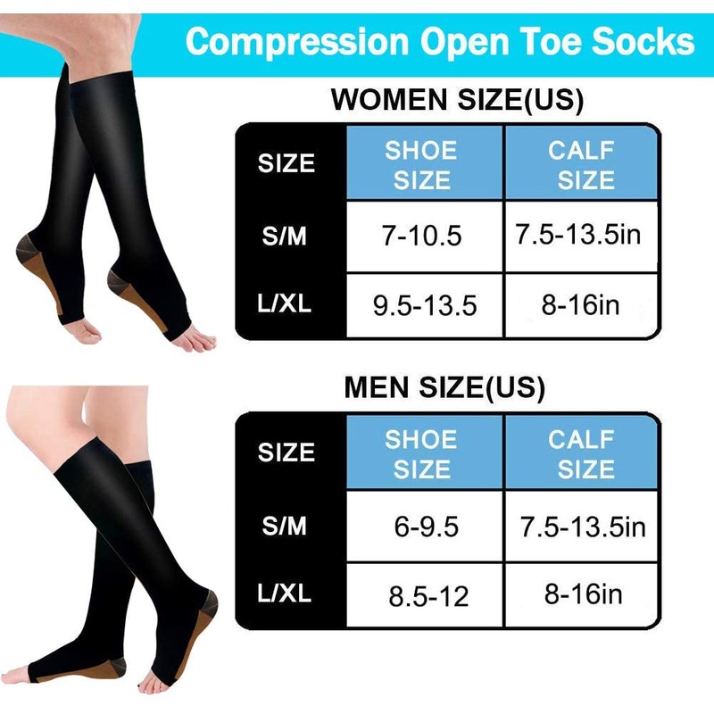 - Compression Open Toe Socks - Sooverki knee high compression open toe socks are made of premium quality medical grade material, lightweight, breathable & durable, sweat-absorbent, anti-slip. we are able to create a high-quality compression sock in a great value. The socks deliver medical grade 20-30 mmgh compression and it will not irritate your skin, they are the best choice for women and men.