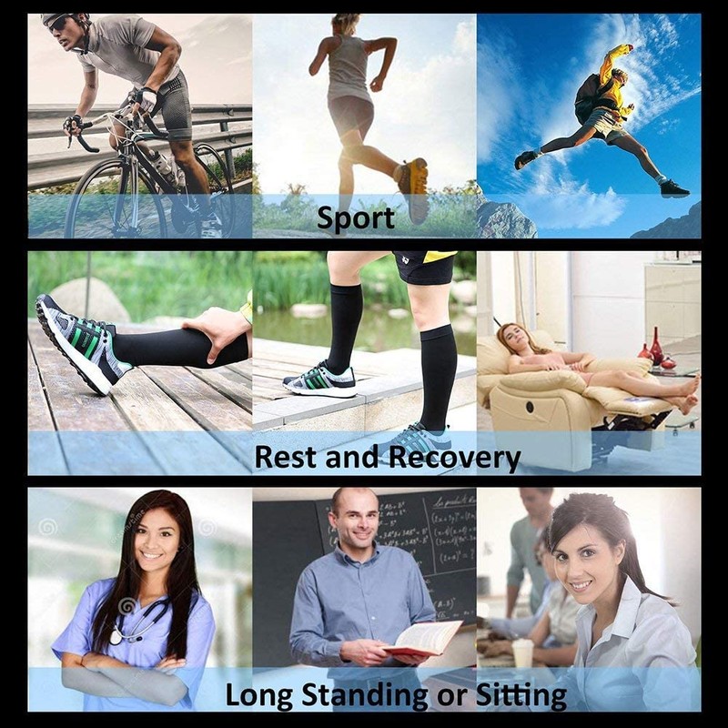 - Suitable for all occasions - The sleeves have a preventive effect are suitable for runners, athletes, fitness workouts, hiking, tennis, cycling, office workers, airplane travelers, or anyone on their feet all day. Whether high or low or high impact, these enable you to warm up safely and recover quickly. The calf sleeves & socks are also perfect for everyday use especially while pregnant, for people in retail, air travel, jobs as a nurse or who require a lot of standing on your feet.