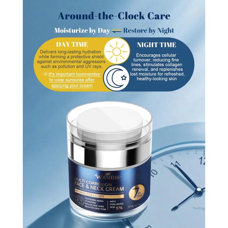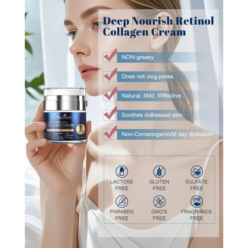 Crema facial y cuello antienvejecimiento: Estamos subiendo la apuesta en la búsqueda de una piel perfecta con un potente humectante facial. ¿Aún mejor? Lo estamos haciendo. Ya sea que ya hayas comenzado a ver signos de envejecimiento o quieras adelantarte al juego, nuestra crema hidratante facial antienvejecimiento es la solución perfecta para reducir las arrugas. Crema facial Infundida con retinol, colágeno marino y ácido hialurónico para minimizar los signos del envejecimiento y mejorar la elasticidad e hidrata profundamente la piel para una apariencia juvenil. Disfruta de una experiencia de cuidado de la piel premium y un potente tratamiento antienvejecimiento; Retinol Advanced Face Moisturizer: Crema antiarrugas especialmente formulada para rostro y cuello, formulada con un 1% de retinol. Esta crema facial antienvejecimiento fomenta la renovación de la piel para una más suave, reduce las arrugas y aumenta la elasticidad. El ácido hialurónico complementa el retinol para ayudar a mantener la hidratación, dejando la piel suave y nutrida sin tensión. Crema de retinol perfecta para una rutina integral de cuidado de la piel.; Crema facial de colágeno natural: A medida que envejecemos, la piel pierde colágeno, lo que provoca arrugas y flacidez. Nuestro humectante de colágeno con retinol combina colágeno bioactivo y retinol estabilizado para nutrir profundamente la piel mientras aumenta la producción natural de colágeno. Este poderoso dúo acelera la renovación celular, restaura la elasticidad y bloquea la hidratación, revelando una tez más regordeta y juvenil, por lo que es una opción ideal para mujeres que buscan reducir las arrugas; Fórmula suave y no irritante: hidrata, ilumina y suaviza las arrugas con este potente pero suave humectante de retinol impregnado con extractos de hierbas calmantes y vitamina C y E para una piel radiante y juvenil. Esta crema antiarrugas ligera, refrescante y no grasa es adecuada para todo tipo de pieles, se absorbe rápidamente para reducir los poros, las líneas finas y las arrugas. Úsalo diariamente en la cara, el cuello y el pecho por la mañana y por la noche para una piel más firme y revitalizada y un aspecto fresco y juvenil.; Hidratante de día y noche: nuestra crema facial antienvejecimiento está diseñada para proporcionar un cuidado de tu piel las 24 horas. Ya sea que tengas 20 años, 40 años o más, esta crema facial de colágeno está diseñada tanto para hombres como para mujeres, hidrata profundamente, reafirma y revitaliza para ayudarte a lograr un brillo saludable y juvenil en cualquier etapa de la vida. Todos nuestros productos estan en inglés SKU 100625019094