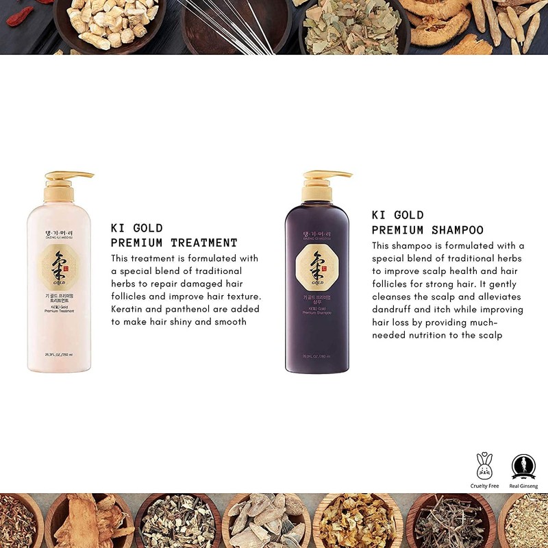 - Pure extract of 11 active medicinal plants decocted with a high concentration of Korea Ginseng. Fresh and soft herbal medicine scent. Ki Gold Premium moisturizes and nourishes the scalp, hair root and hair. It restores and maintains maximal moisture level, leaving the hair feeling smooth and fresh.