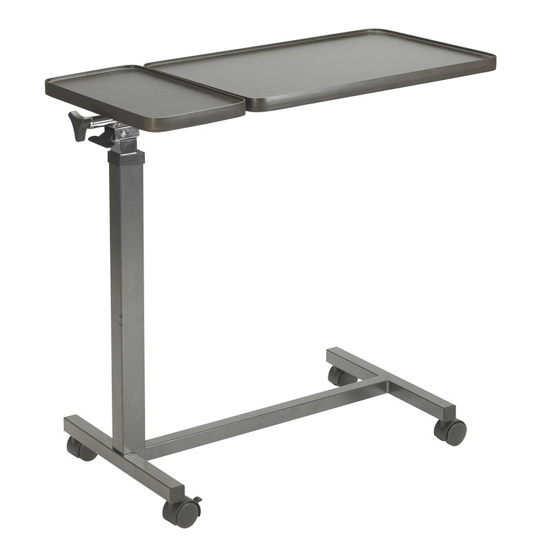 The Multi-Purpose Tilt-Top Split Overbed Table from Drive Medical gives you two stable, independent surfaces for eating, working, or entertainment. The height of the attractive wood-grain tabletops is infinitely adjustable and the larger surface can be angled to place it at the ideal position for you. The smaller surface always remains flat, perfect for keeping food, drink, glasses, remote controls, or other items secure. This Multi-Purpose Tilt-Top Split Overbed Table can also be used as a mobile workstation, a drafting table, a laptop desk, an artist's table, or an entertainment tray. With a 55 pound weight capacity, you can be assured your items will be safe and secure on this table. The tabletop can be raised as high as 46 inches allowing it to also be used as a standing desk. Additionally, the Overbed Table's caster wheels make it easy to maneuver and allow the table to be placed wherever it is most convenient.