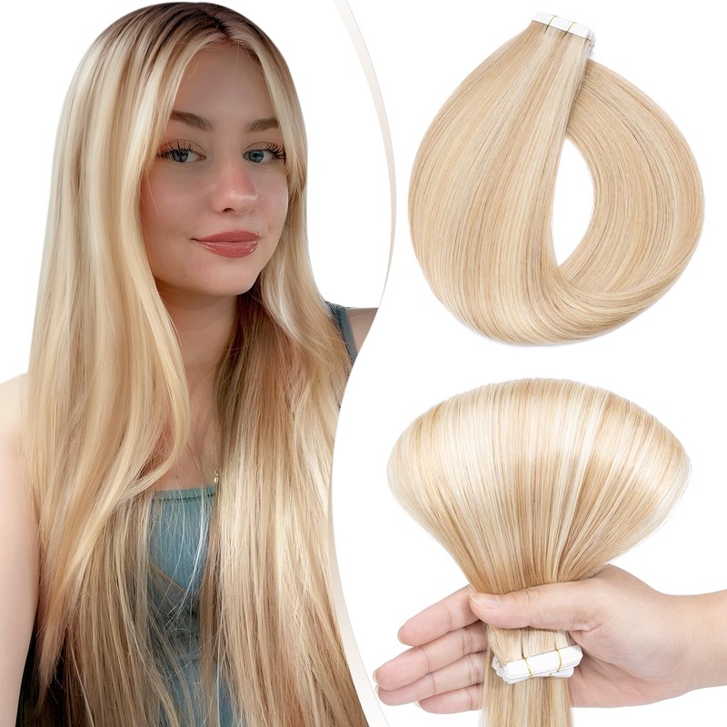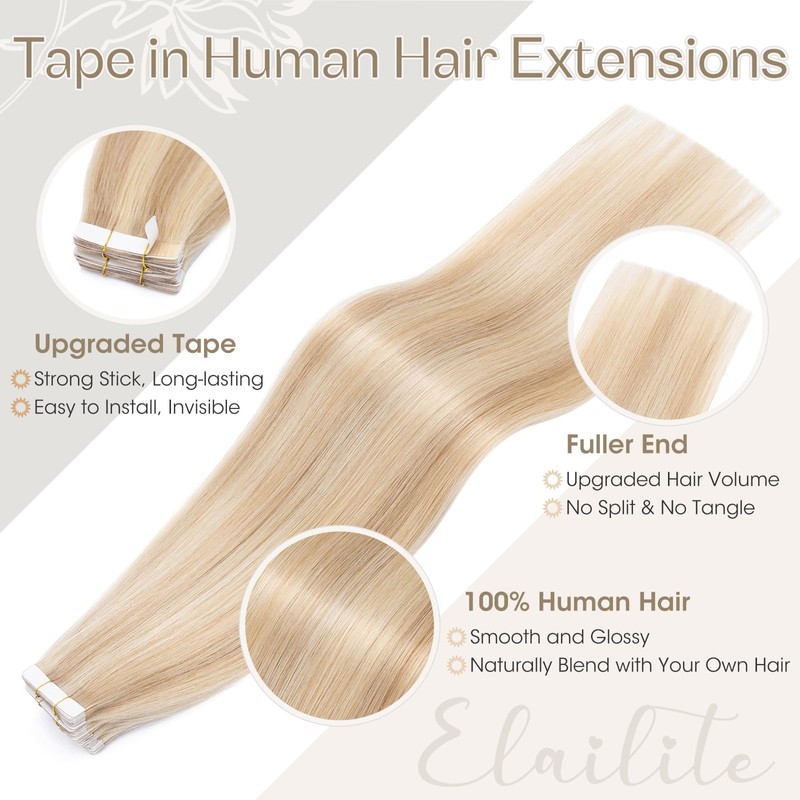 Elailite Tape in Hair Extensions Human Hair Real Human Hair 10 Pcs Invisible Thin Type - Seamless Skin Weft Remy Hair Extension (#18/613 Ash Blonde Mix Bleach Blonde, 22 Inch-15g)