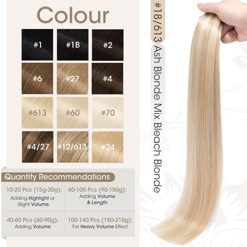 - Quantity: 10 pcs, 15g(1.5g/pcs) - Hair Length: 22 Inch - Hair Colour: #18/613 Ash Blonde Mix Bleach Blonde ✅We recommend 50g-100g for adding volume, and 100g-150g for stretching length.