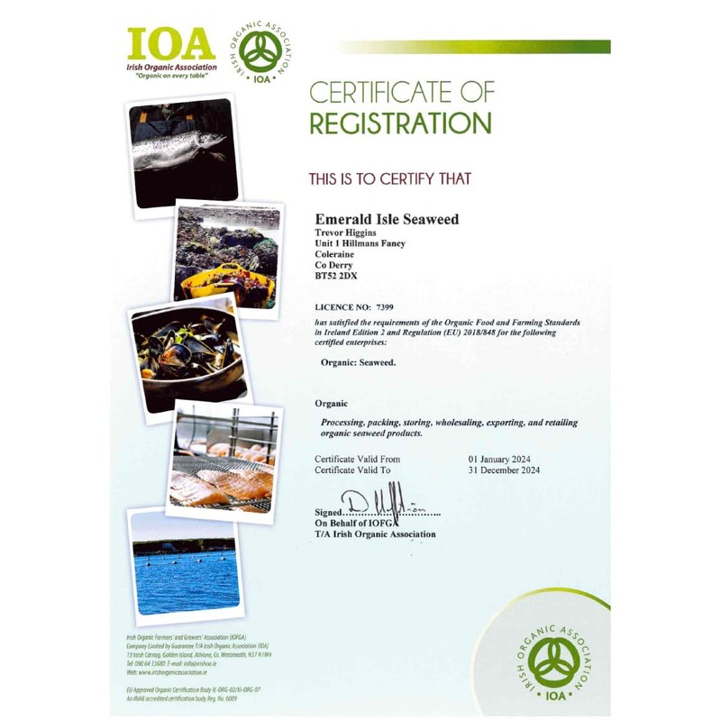 Product descriptionEmerald Isle Dulse seaweed capsules, are a natural combination of three strains of red marine algae, which is combined according to our own family recipe.Certified Organic by the Irish Organic Farmers and Growers Association.Emerald Isle Red Seaweed Capsules (RMA) are a natural source of Iodine, which supports healthy thyroid function and is good for general health and skin condition.Total of 45 grams of pure 100% Red Seaweed in 500 mg capsules with nothing added. A total iodine content of around 132 mcg in each capsule. Daily serving Size 1-2 tablet (HPMC capsule)Suitable for vegetarians veganCapsules can be opened and sprinkled on to your food if desired.The blend of the three red seaweeds provide a complete protein with all of the essential amino acids, many vitamins, minerals and other trace elements. Most importantly, these seaweeds contain the unique phyto-chemicals known as sulphated polysaccharides which are a protein bound carbohydrate that supports the body's immune response to foreign invaders and can inhibit certain viruses.RMA red seaweeds provide a full spectrum of natural vitamins, minerals, proteins, selenium, antioxidants, essential fatty acids, enzymes, trace elements, amino acids, and all the rarer nutrients like B12, Magnesium and zinc. Beneficial for gut bacteria.RMA blend also has a low iodine content to suit certain diets and this brings it within the recommended daily intake for iodine.Our seaweed is hand harvested directly from the Irish Atlantic coast, hand dried and chopped by ourselves. No chemicals or other substances are used in production. No microwave, or any harmful process is undertaken.It may improve you metabolic rate.It may enhance your digestive system and prevent various digestive problems,Ingredientsseaweed