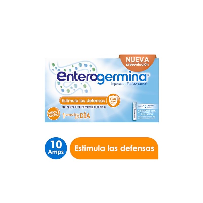 - ESTIMULA LAS DEFENSAS NATURALES DEL ORGANISMO: Enterogermina Probióticos estimula las defensas naturales del organismo protegiendo contra ataques de microbios dañinos Cada ampolleta contiene 4 Billones de UFC de probióticos Bacillus Clausii