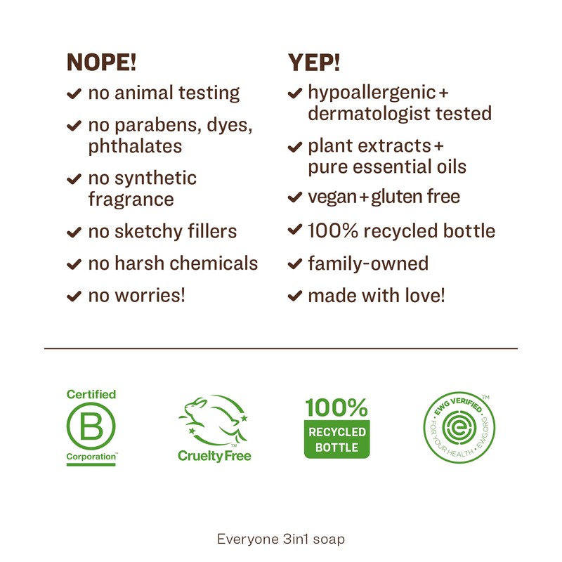 • Clean Ingredients: Everyone 3-in-1 soap is EWG verified, GMO free, cruelty free, gluten free, triclosan free, and synthetic fragrance free