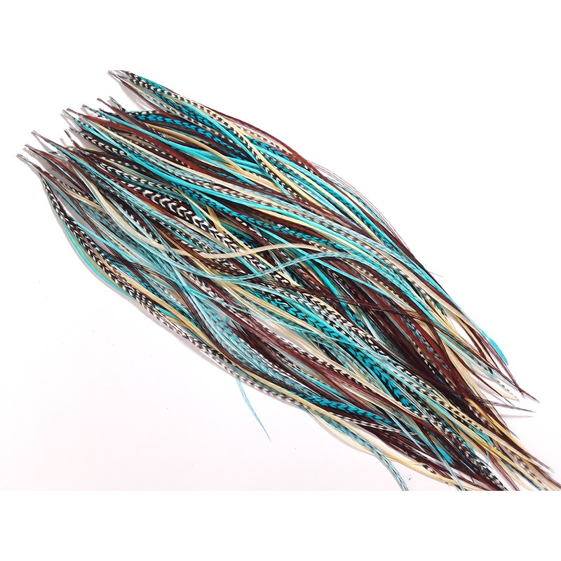 - These Hair Feather color is Aqua, Brown, Grizzly Beige & White with Grizzly all bonded together at the tip.