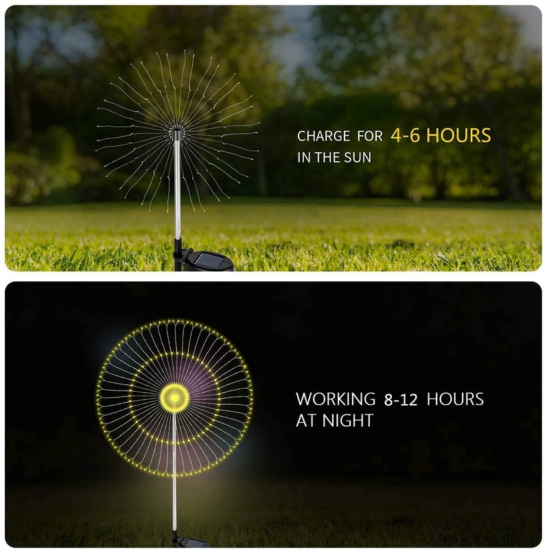 - Upgrade design: the solar fireworks light has a 5 x 5 cm solar panel that can be charged for 4 to 6 hours and can be used for 8 to 12 hours at night (the lighting mode affects the working time).