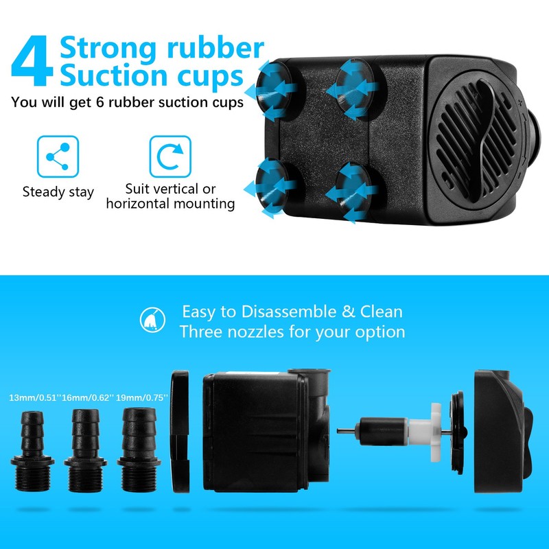 - COMPACT BUT POWERFUL--The fountain pumps compact design is easy to hide & disguise, 25W super efficiency motor continually lift water column. Reasonable long power cord is heavy duty and easy to installation. The pump has 4 strong rubber suction cups at the bottom of the fountain pump helps keep in your fish tank.