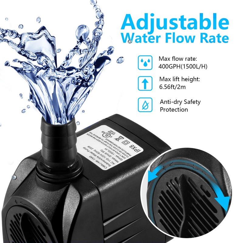 ? Adjustable water flow rate: This fountain pump has an adjustable knob to control the water flow rate.