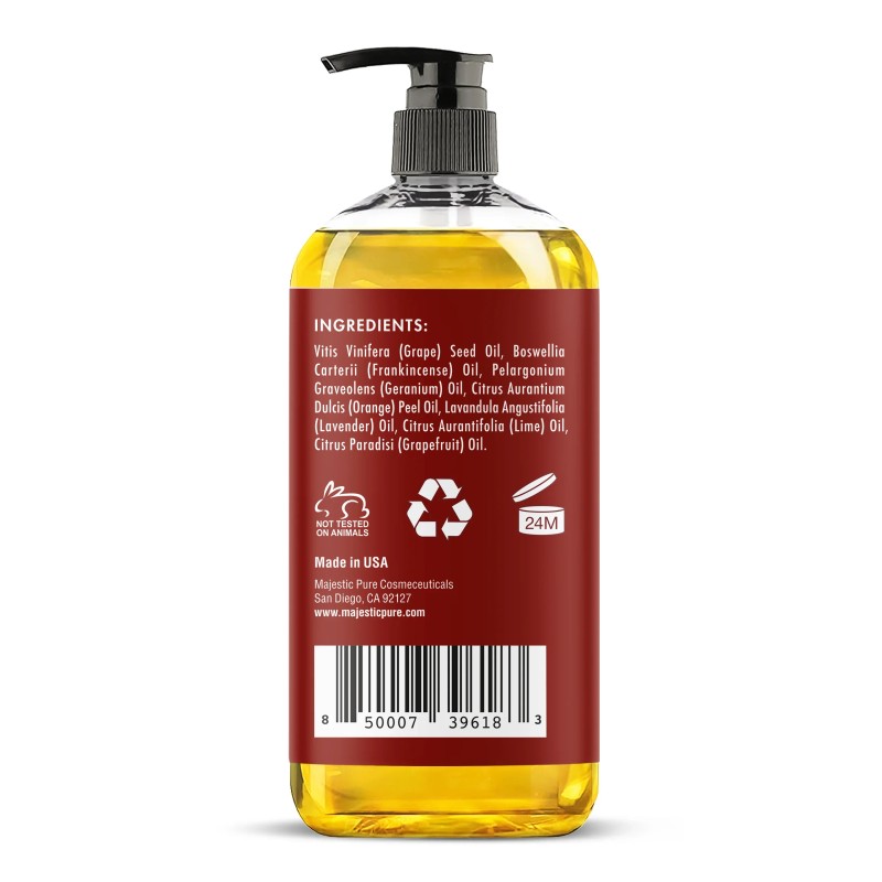 - Majestic Pure Stretch Mark & Scar Rejuvenating Massage Oil is cruelty free and not tested on animals.