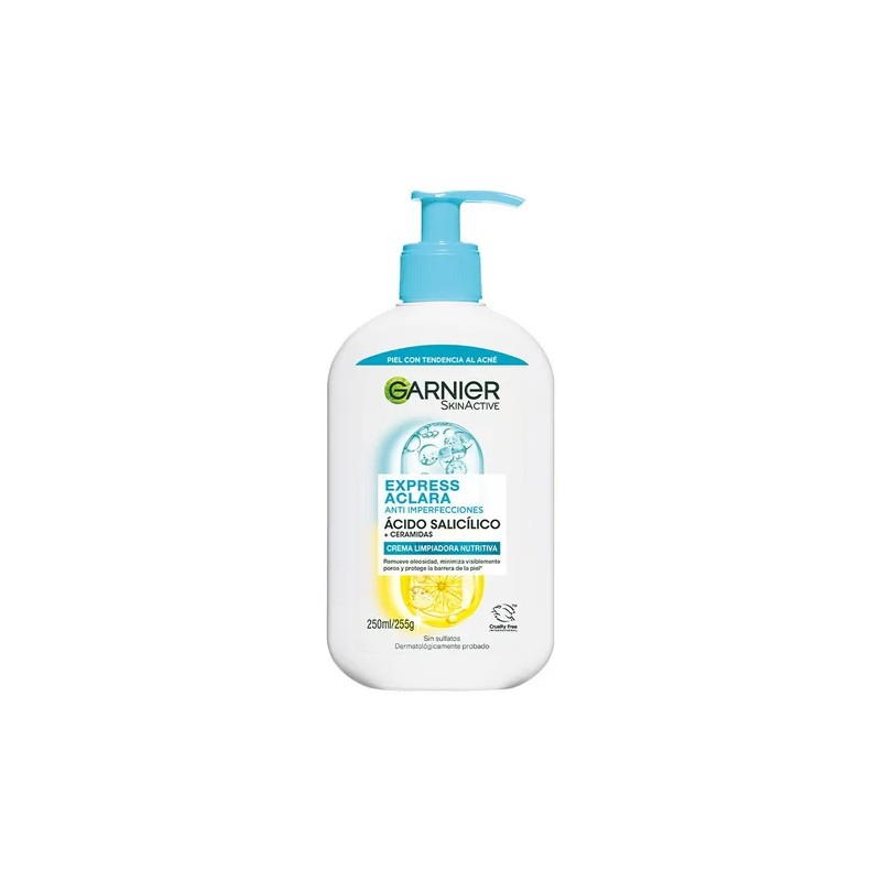 El Garnier Express Aclara Gel Limpiador Antiimperfecciones es un tratamiento concentrado diseñado para pieles con tendencia al acné. Su fórmula combina: