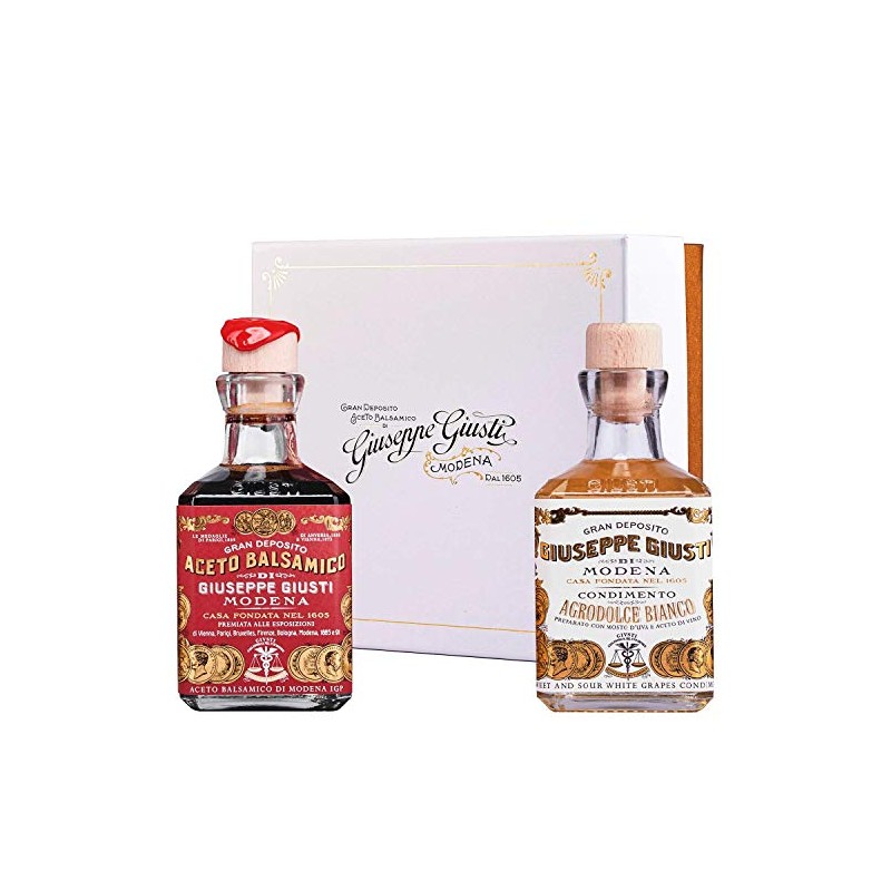 - THIS UNIQUE SET combines the TWO MOST POPULAR products from the Giuseppe Giusti collection of fine Balsamic Vinegars: (1) one bottle of Gran Deposito 3 Medals Balsamic Vinegar of Modena, AGED minimum 12 years and (1) one bottle of Agrodolce Bianco, White Wine Vinegar Condiment.