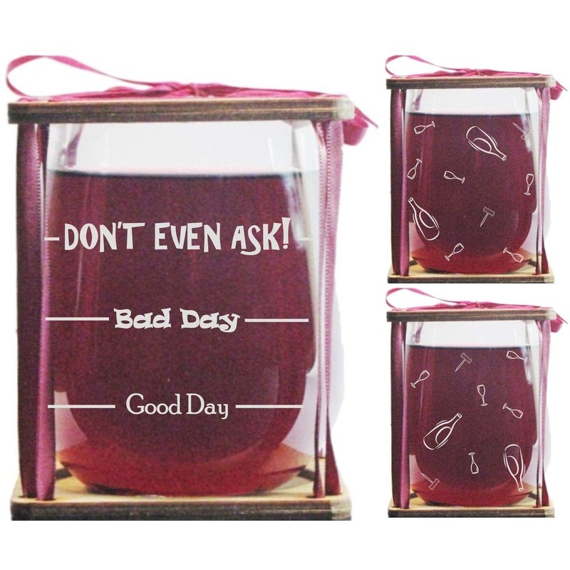 Good Day, Bad Day, Don't Even Ask! Stemless Wine Glass and Presentation Packaging