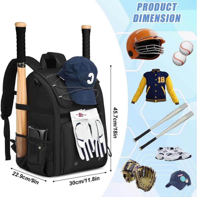 【Spacious & Organized Storage】Dimensions: 17.3"H x 11.8"W x 9.8"D. This baseball bag is equipped with multiple pockets and compartments to neatly store all essential gear, including baseballs, cleats, bats, helmets, caps, gloves, jerseys, water bottles, sunglasses, and any other sports accessories your child needs. Fully equip your young athlete to dominate the game and secure victory with ease
