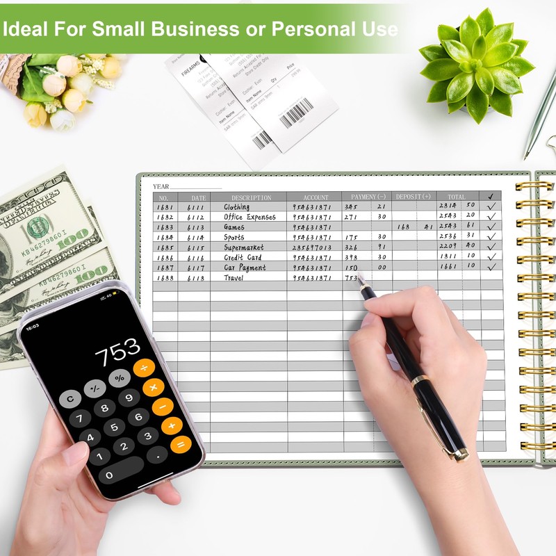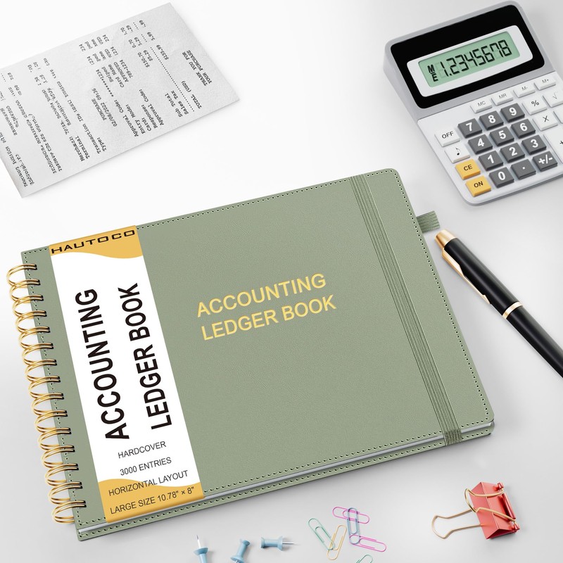 HAUTOCO Hardcover Accounting Ledger Book for Small Business Bookkeeping Horizontal Money Expense Tracker Notebook with 2 Storage Pouch, Personal Columnar Log Journal 10.78 x 8'', Olive Green