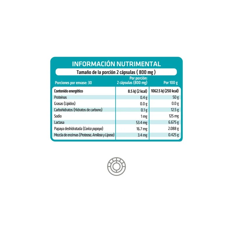 Composición Superior: Incluye enzimas digestivas como Proteasa, Amilasa y Lipasa, junto con Papaya deshidratada, libres de gluten y lactosa.