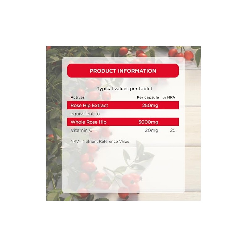 Product descriptionWhy Choose Healthspan's Rose Hip?Healthspan's vegan Rose Hip tablets contain only the very highest quality natural extract of rose hips. Each one-a-day tablet provides the equivalent of 5,000mg of whole rose hips.They've included vitamin C, which is involved in the process of producing collagen, needed to form cartilage C the flexible tissue that protects your bones at the joint.What is Rose Hip?Rose hip is the nutritious 'superfruit' of the wild rose species Rosa canina, and has long been revered as an excellent source of vitamin C. It also contains naturally powerful flavonoids, nutritious fatty oils, tannins and polyphenols, which has made rose hip a popular choice for beauty products.It's almost impossible to drink enough rose hip tea to ensure a health benefit, so a daily supplement in tablet form is an easy way of ensuring a good dose of its nutrients.IngredientsRose Hip Prep. (Rose Hip Extract, Maltodextrin), Bulking Agent: Dicalcium Phosphate, Bulking Agent: Microcrystalline Cellulose, Coating (Hypromellose, Fruit and Vegetable Concentrate, Dicalcium Phosphate, Talc, Citric Acid), Vitamin C Prep. (Ascorbic Acid, Hypromellose), Bulking Agent: Calcium Prep. (Calcium Carbonate, Maltodextrin), Stearic Acid, Anti-Caking Agent: Silicon Dioxide, Magnesium Stearate.DirectionsSwallow one tablet daily with water. Recommended intake should not be exceeded.Safety Warningf you are taking any prescribed medication or have any medical conditions always consult your doctor or pharmacist before taking vitamins or supplements. Food supplements should not be used as a substitute for a varied and balanced diet and a healthy lifestyle. Store in a cool dry place, in original packaging, out of sight and reach of young children. If you experience an adverse reaction, stop taking the supplement and seek medical advice.