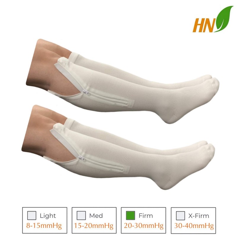 Provides 20-30 mmHg compression grade firm support for leg calf swelling and fatigue relief. Energize your legs from fatigue and helps reduce swelling for better recovery. Helps increase leg circulations throughout the day for better movement and blood flow. 2 pairs combo pack with choice of navy, white or mix. Closed toe full length support up to knee high. The zipper helps makes putting on the socks much easier and also taking it off. Comes with Inner fabric helps protect your skin against the zipper.