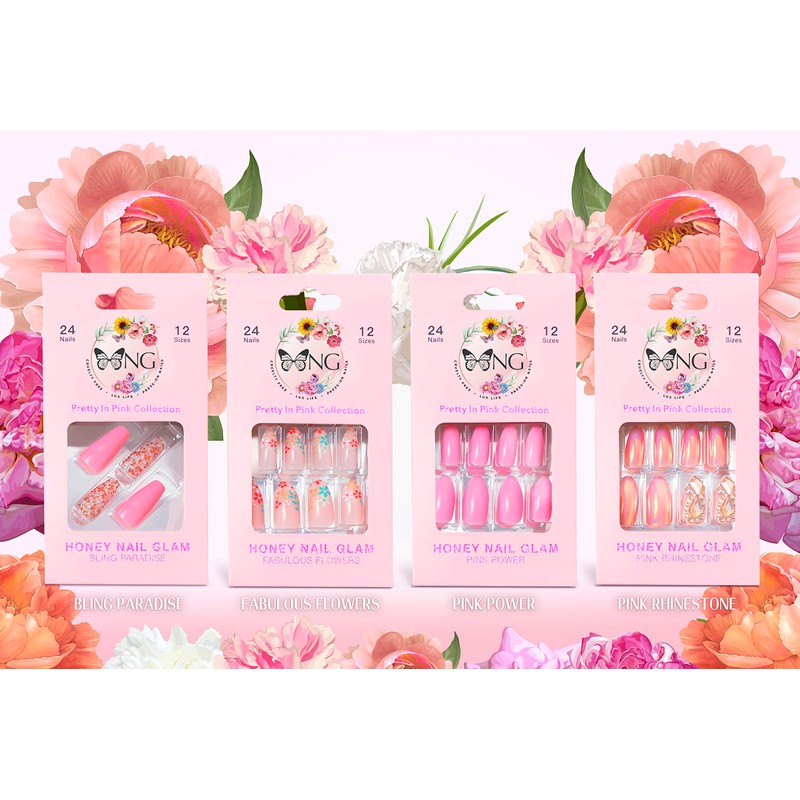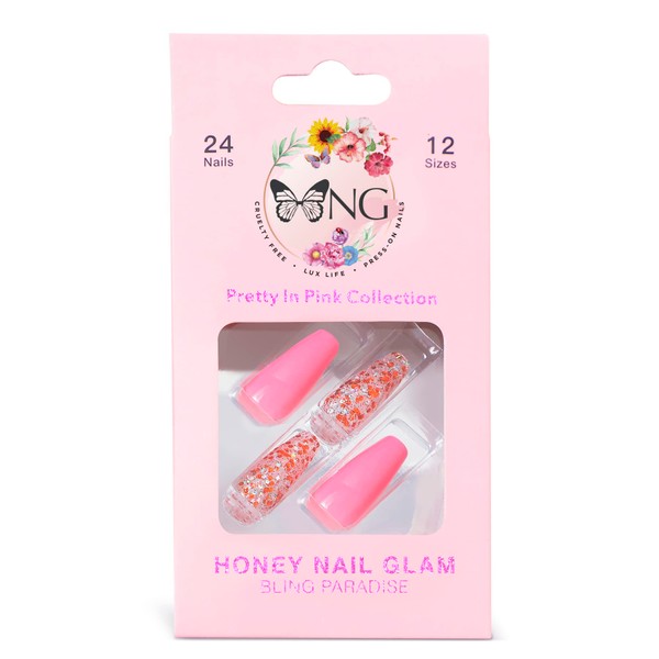 Honey Nail Glam Luxury Press On Nails | Pretty In Pink Bling Paradise Collection in 12 Sizes | 24 Nail Kit with Glue