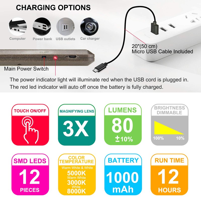 - ►[Rechargeable Full Page Magnifier]-The magnifier with light powered by 3.7V 1000mah internal Lithium polymer battery and micro USB cable. Recharged by any USB ports, power banks, laptop and computer charger (not included).Full charging time is approximately 3.5-4.5 hours can support lighting up to 12 hours.