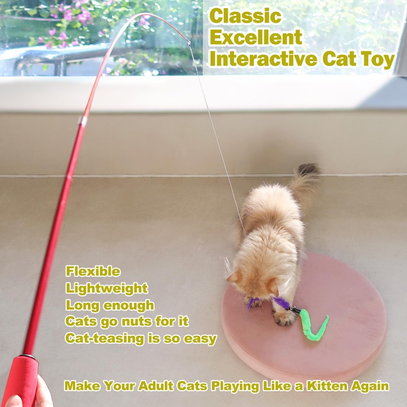 - 4. TELESCOPIC CAT FISHING POLE TOY DESIGN : This cat toy wand extends from 15 in to 38.9. Very lightweight, flexible, durable, portable and easy to store. The fully extend cat feather wand is extra long ( 38.9 in) plus the string (23.6in) which cover a large space for playing. Cat-teasing is no longer a tough job for you. You can even sit on the couch watching TV while teasing cats with this cat toys