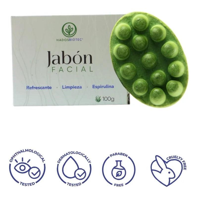 El Jabón facial es un producto biotecnológico exclusivo, desarrollado especialmente para el cuidado de la piel facial. Su desarrollo involucra ciencia e investigación mexicana. Contiene Espirulina, fuente natural de antioxidantes que ayudan a proteger la piel contra los signos del envejecimiento y las condiciones climáticas adversas. Además, contiene compuestos antimicrobianos que pueden ayudar en la eliminación de las bacterias que causan el acné. También contiene Aceite esencial de bergamota italiana utilizado en aromaterapia para reducir la ansiedad y el estrés, y mejorar el estado de ánimo. El Jabón facial proporciona una limpieza profunda de la piel, permitiendo la eliminación de grasas, microorganismos e imperfecciones. Aplica el Jabón facial al menos dos veces al día, preferentemente en mañana y noche, o cuando se requiera limpiar el rostro. Masajea con las manos bajo agua para promover la formación de espuma y aplica mediante movimientos circulares sobre el rostro y el contorno de los ojos. Se recomienda aplicar, posteriormente, una crema facial hidratante. Nuestro Jabón facial es un producto con los más altos estándares de calidad. Dermatológicamente aprobado y libre de crueldad animal.